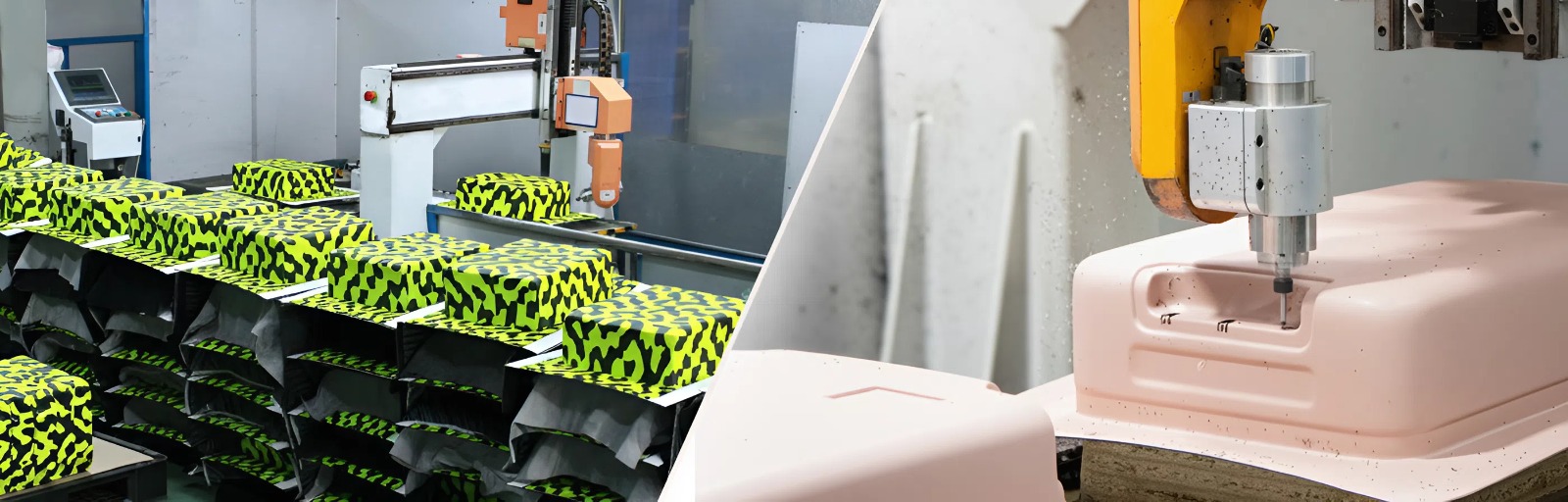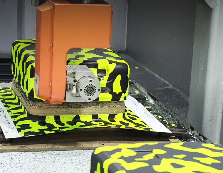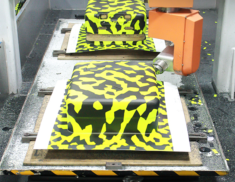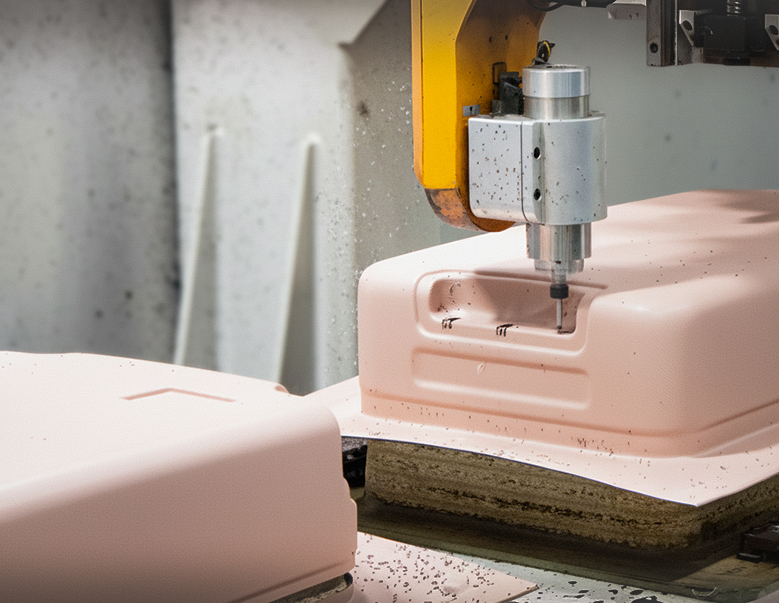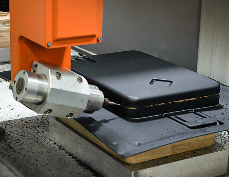- Manually load the PC shell onto the jig and verify alignment. Auto-cutting takes place. The machine performs successive cutting (for the zipper line, handle, wheels, etc.) and drilling (for rivets/screws).