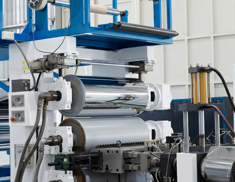 3. Raw materials will be pushed through the tubes and then passed through two rollers and a PC film, if needed.